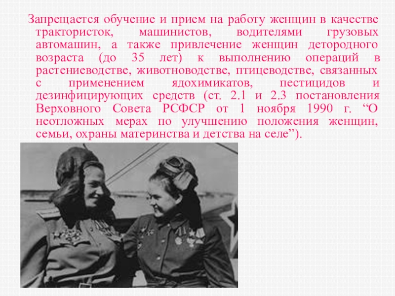 машинистов, водителями грузовых автомашин, а также привлечение женщин детородного возраста (до 35 лет) к выполнению операций в растениеводстве, животноводстве, птицеводстве, связанных с применением ядохимикатов, пестицидов и дезинфицирующих средств (ст. 2.1 и 2.3 постановления Верховного Совета РСФСР от 1 ноября 1990 г. “О неотложных мерах по улучшению положения женщин, семьи, охраны материнства и детства на селе”).