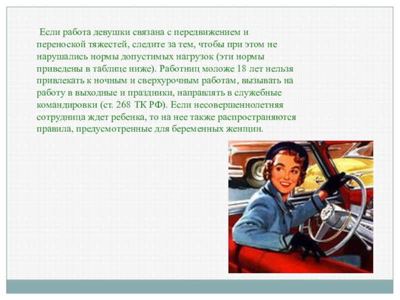 за тем, чтобы при этом не нарушались нормы допустимых нагрузок (эти нормы приведены в таблице ниже). Работниц моложе 18 лет нельзя привлекать к ночным и сверхурочным работам, вызывать на работу в выходные и праздники, направлять в служебные командировки (ст. 268 ТК РФ). Если несовершеннолетняя сотрудница ждет ребенка, то на нее также распространяются правила, предусмотренные для беременных женщин.