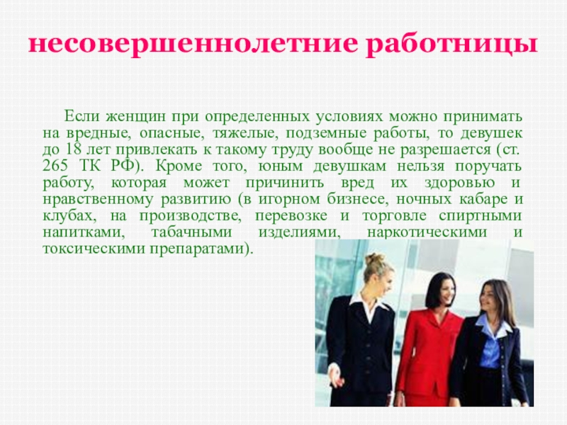 принимать на вредные, опасные, тяжелые, подземные работы, то девушек до 18 лет привлекать к такому труду вообще не разрешается (ст. 265 ТК РФ). Кроме того, юным девушкам нельзя поручать работу, которая может причинить вред их здоровью и нравственному развитию (в игорном бизнесе, ночных кабаре и клубах, на производстве, перевозке и торговле спиртными напитками, табачными изделиями, наркотическими и токсическими препаратами).