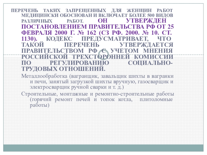Слайд 9Перечень таких запрещенных для женщин работ медицински обоснован и включает более