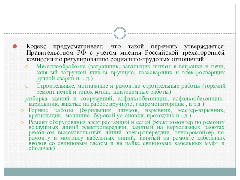 500 видов различных работ. Он утвержден постановлением Правительства РФ от 25 февраля 2000 г. № 162 (СЗ РФ. 2000. № 10. Ст. 1130). Кодекс предусматривает, что такой перечень утверждается Правительством РФ с учетом мнения Российской трехсторонней комиссии по регулированию социально-трудовых отношений.