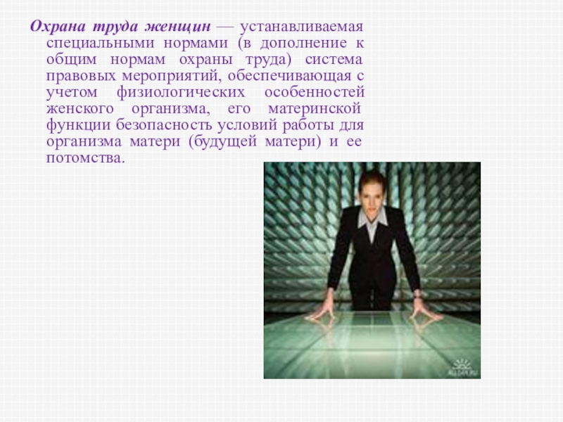 Слайд 6Охрана труда женщин — устанавливаемая специальными нормами (в дополнение к общим