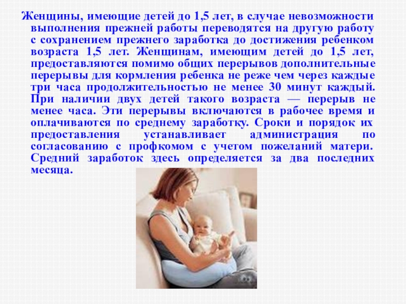 прежней работы переводятся на другую работу с сохранением прежнего заработка до достижения ребенком возраста 1,5 лет. Женщинам, имеющим детей до 1,5 лет, предоставляются помимо общих перерывов дополнительные перерывы для кормления ребенка не реже чем через каждые три часа продолжительностью не менее 30 минут каждый. При наличии двух детей такого возраста — перерыв не менее часа. Эти перерывы включаются в рабочее время и оплачиваются по среднему заработку. Сроки и порядок их предоставления устанавливает администрация по согласованию с профкомом с учетом пожеланий матери. Средний заработок здесь определяется за два последних месяца.