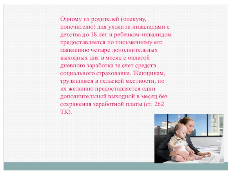 до 18 лет и ребенком-инвалидом предоставляется по письменному его заявлению четыре дополнительных выходных дня в месяц с оплатой дневного заработка за счет средств социального страхования. Женщинам, трудящимся в сельской местности, по их желанию предоставляется один дополнительный выходной в месяц без сохранения заработной платы (ст. 262 ТК).