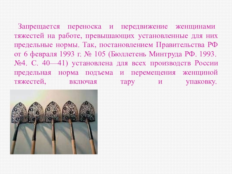 для них предельные нормы. Так, постановлением Правительства РФ от 6 февраля 1993 г. № 105 (Бюллетень Минтруда РФ. 1993. №4. С. 40—41) установлена для всех производств России предельная норма подъема и перемещения женщиной тяжестей, включая тару и упаковку.