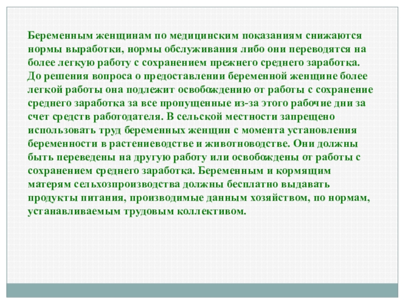 Слайд 15Беременным женщинам по медицинским показаниям снижаются нормы выработки, нормы обслуживания либо