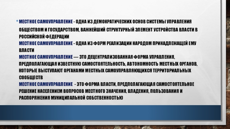 Слайд 6Местное самоуправление - одна из демократических основ системы управления обществом и государством,