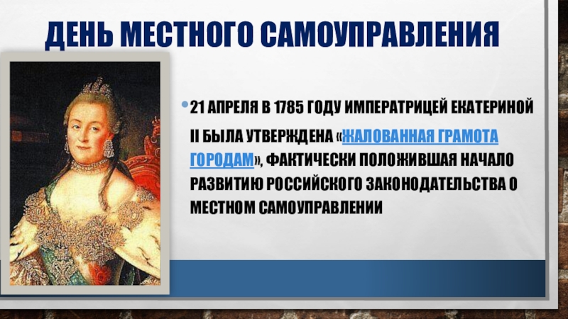 утверждена «Жалованная грамота городам», фактически положившая начало развитию российского законодательства о местном самоуправлении