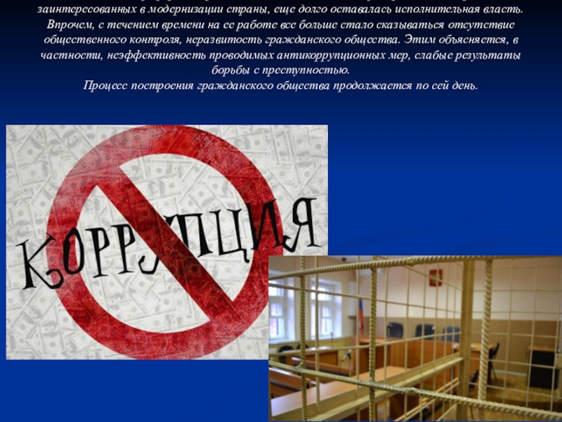 долго оставалась исполнительная власть. Впрочем, с течением времени на ее работе все больше стало сказываться отсутствие общественного контроля, неразвитость гражданского общества. Этим объясняется, в частности, неэффективность проводимых антикоррупционных мер, слабые результаты борьбы с преступностью.