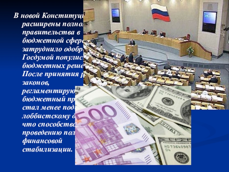 затруднило одобрение Госдумой популистских бюджетных решений. После принятия ряда законов, регламентирующих бюджетный процесс, он стал менее подвержен лоббистскому давлению, что способствовало проведению политики финансовой стабилизации.