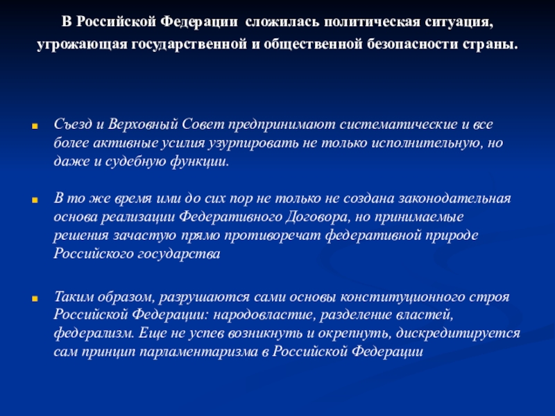 Таким образом, разрушаются сами основы конституционного строя Российской Федерации: народовластие, разделение властей, федерализм. Еще не успев возникнуть и окрепнуть, дискредитируется сам принцип парламентаризма в Российской Федерации