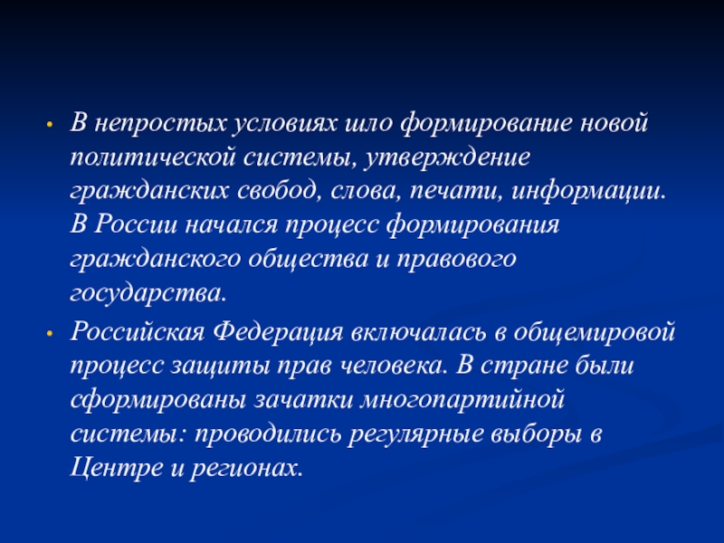 В непростых условиях шло формирование новой политической системы, утверждение гражданских свобод,