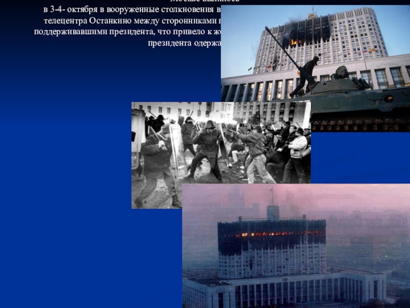 в 3-4- октября в вооруженные столкновения в районах здания Верховного Совета и телецентра Останкино между сторонниками парламента и силовыми структурами, поддерживавшими президента, что привело к жертвам. В итоге силы, поддерживающие президента одержали победу.