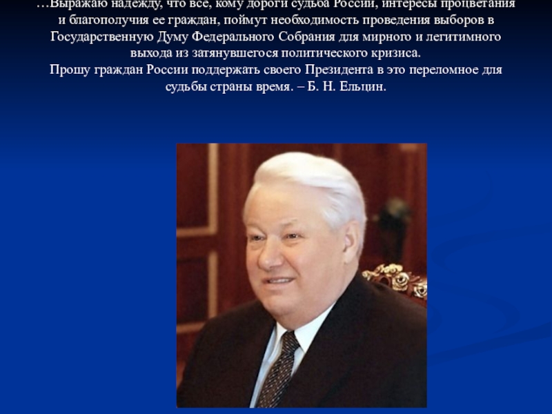 Прошу граждан России поддержать своего Президента в это переломное для судьбы страны время. – Б. Н. Ельцин.