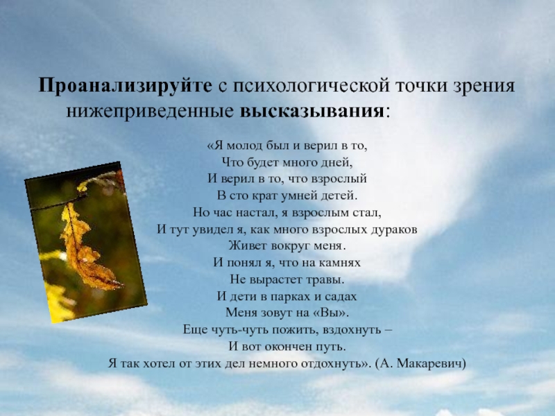 Проанализируйте с психологической точки зрения нижеприведенные высказывания:«Я молод был и верил в то, Что будет много дней,И