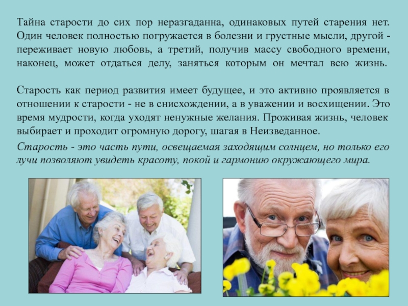 Слайд 12Тайна старости до сих пор неразгаданна, одинаковых путей старения нет. Один
