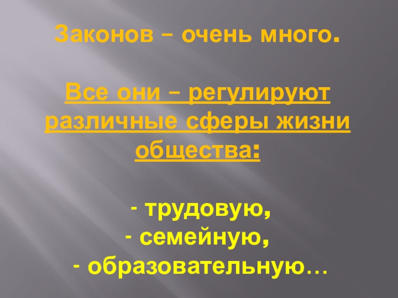 Слайд 6Законов – очень много. Все они – регулируют различные сферы жизни общества: