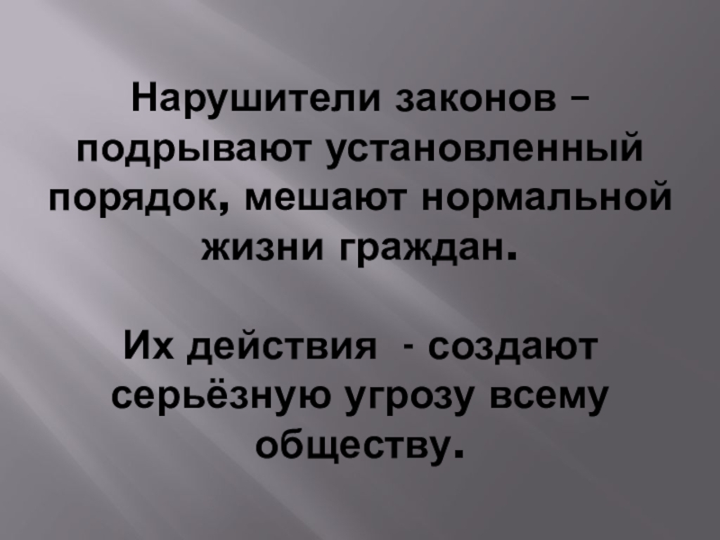 Нарушители законов – подрывают установленный порядок, мешают нормальной жизни граждан.  Их действия - создают серьёзную угрозу