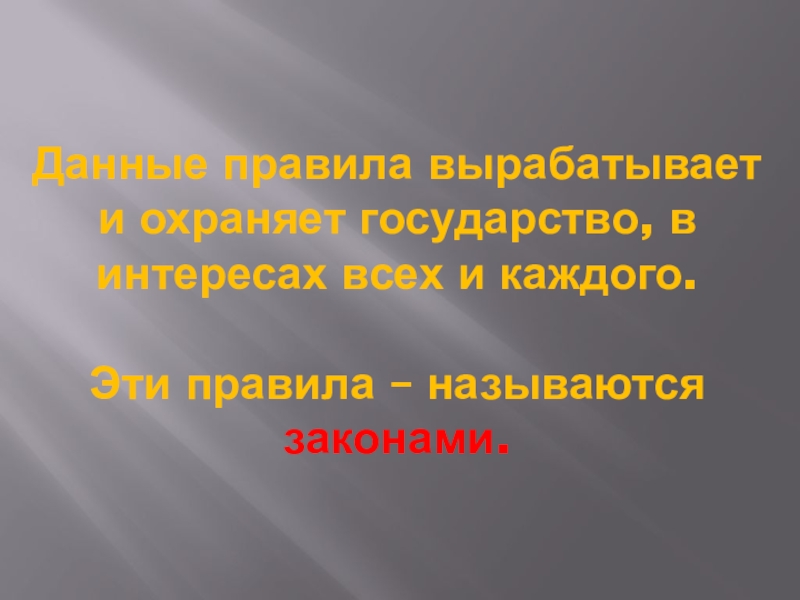 Слайд 4Данные правила вырабатывает и охраняет государство, в интересах всех и каждого. Эти