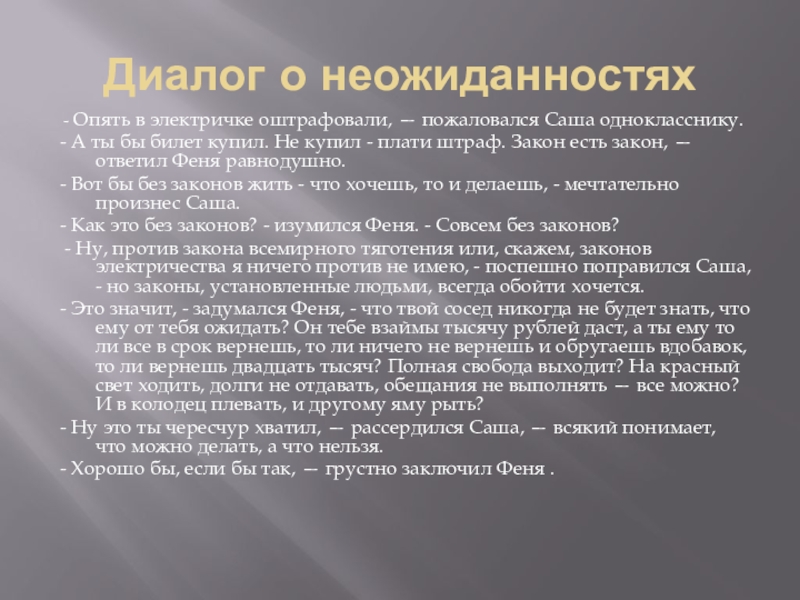- Это значит, - задумался Феня, - что твой сосед никогда не будет знать, что ему от тебя ожидать? Он тебе взаймы тысячу рублей даст, а ты ему то ли все в срок вернешь, то ли ничего не вернешь и обругаешь вдобавок, то ли вернешь двадцать тысяч? Полная свобода выходит? На красный свет ходить, долги не отдавать, обещания не выполнять — все можно? И в колодец плевать, и другому яму рыть?