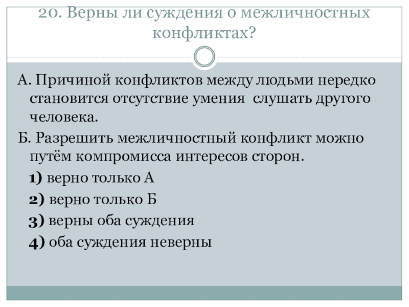 Слайд 2120. Верны ли суждения о межличностных конфликтах?