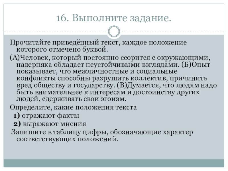 постоянно ссорится с окружающими, наверняка обладает неустойчивыми взглядами. (Б)Опыт показывает, что межличностные и социальные конфликты способны разрушить коллектив, причинить вред обществу и государству. (В)Думается, что людям надо быть внимательнее к интересам и достоинству других людей, сдерживать свои эгоизм.