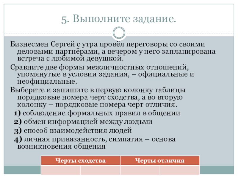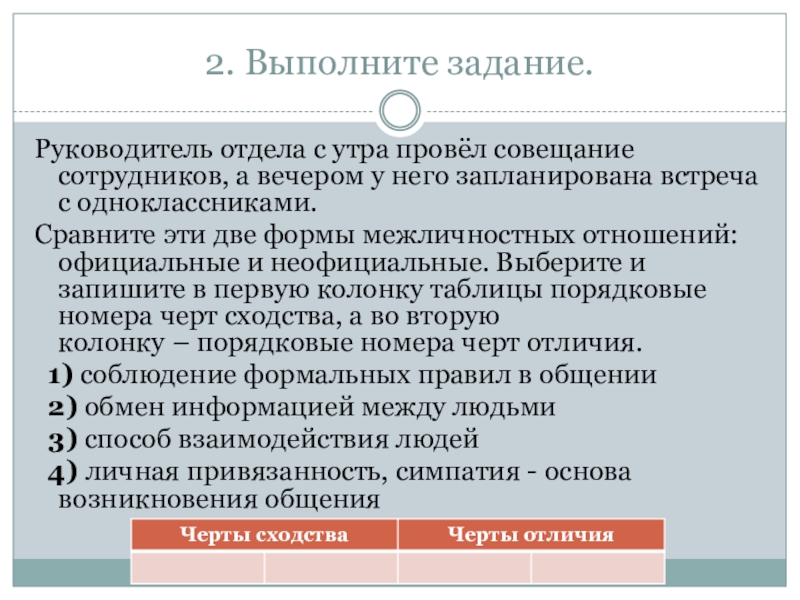 Сравните эти две формы межличностных отношений: официальные и неофициальные. Выберите и запишите в первую колонку таблицы порядковые номера черт сходства, а во вторую колонку – порядковые номера черт отличия.