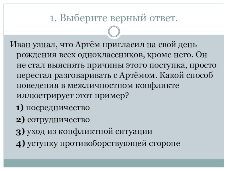 рождения всех одноклассников, кроме него. Он не стал выяснять причины этого поступка, просто перестал разговаривать с Артёмом. Какой способ поведения в межличностном конфликте иллюстрирует этот пример?