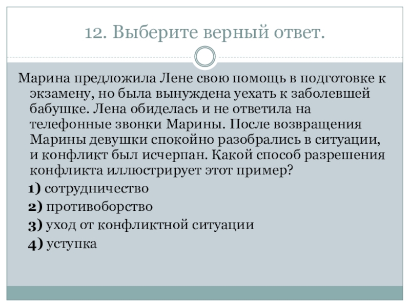 экзамену, но была вынуждена уехать к заболевшей бабушке. Лена обиделась и не ответила на телефонные звонки Марины. После возвращения Марины девушки спокойно разобрались в ситуации, и конфликт был исчерпан. Какой способ разрешения конфликта иллюстрирует этот пример?
