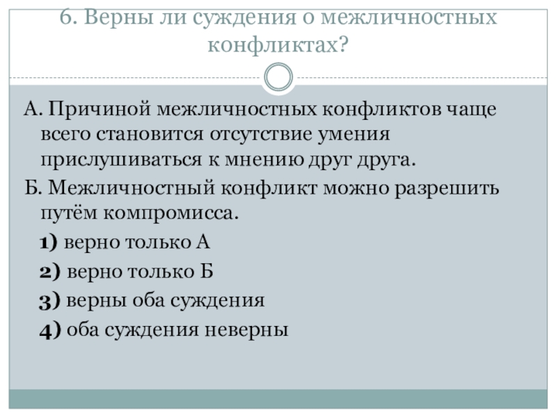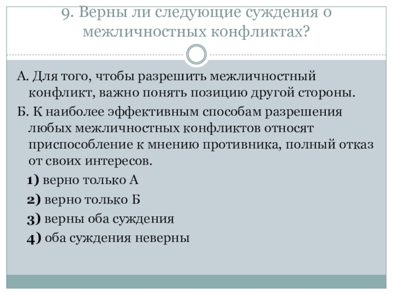 Слайд 43. Верны ли суждения о межличностных конфликтах?