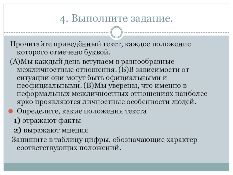 день вступаем в разнообразные межличностные отношения. (Б)В зависимости от ситуации они могут быть официальными и неофициальными. (В)Мы уверены, что именно в неформальных межличностных отношениях наиболее ярко проявляются личностные особенности людей.