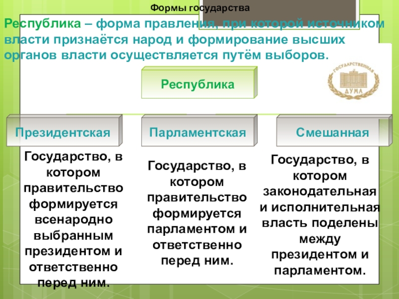 Республика – форма правления, при которой источником власти признаётся народ и формирование высших органов власти осуществляется путём выборов.