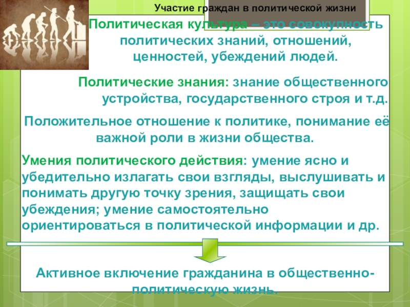 Активное включение гражданина в общественно-политическую жизнь.