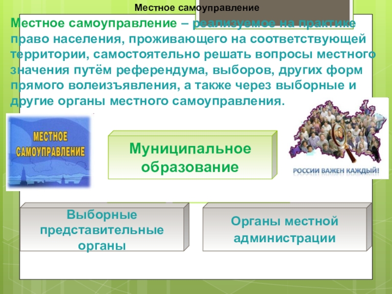 Местное самоуправление – реализуемое на практике право населения, проживающего на