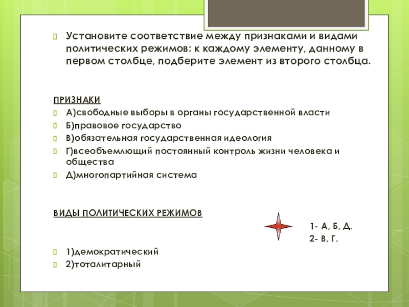Слайд 38Какой из приведённых признаков отличает демократическое правовое государство?