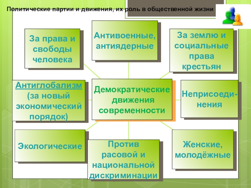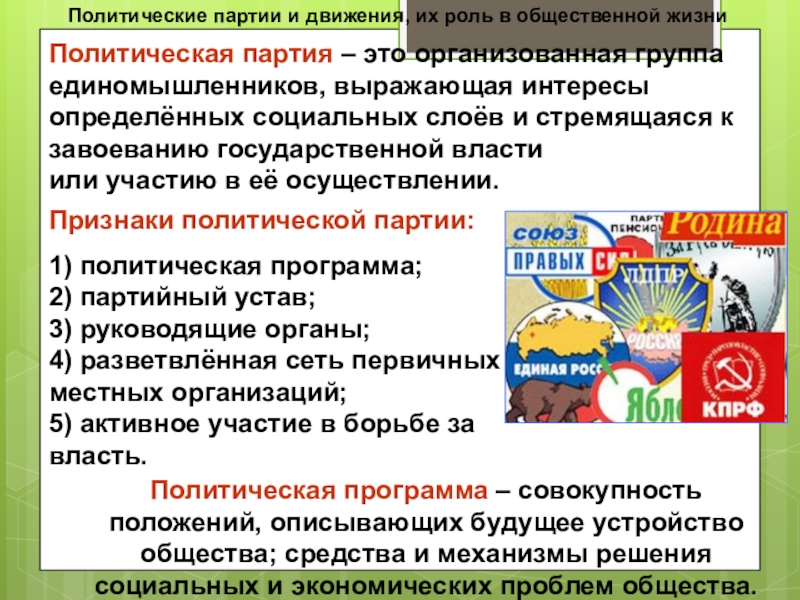 Слайд 32Политические партии и движения, их роль в общественной жизни