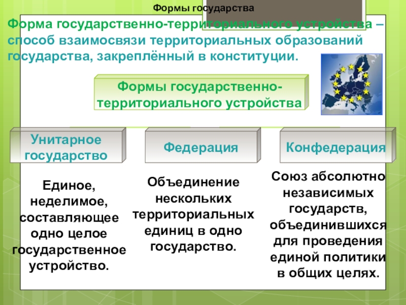 Форма государственно-территориального устройства – способ взаимосвязи территориальных образований государства, закреплённый