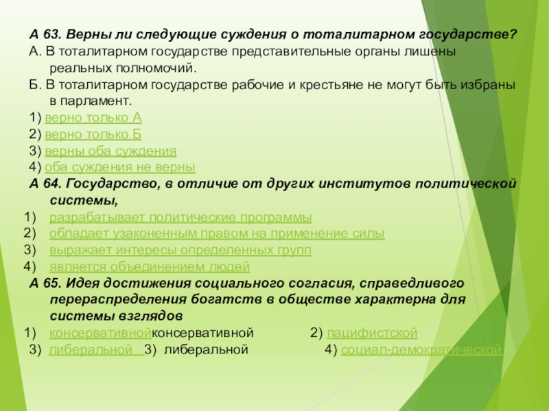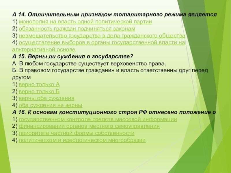 Слайд 6А 14. Отличительным признаком тоталитарного режима является