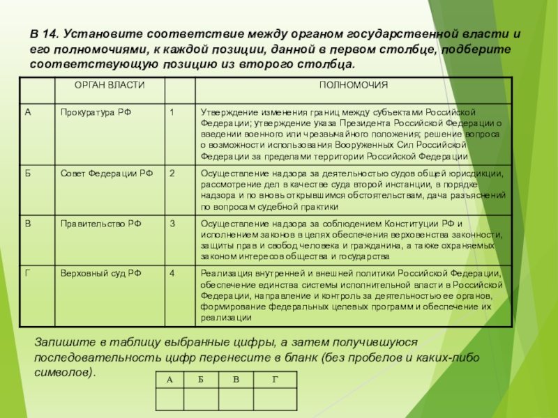 Г) чиновники Д) суд Е) исполнительный