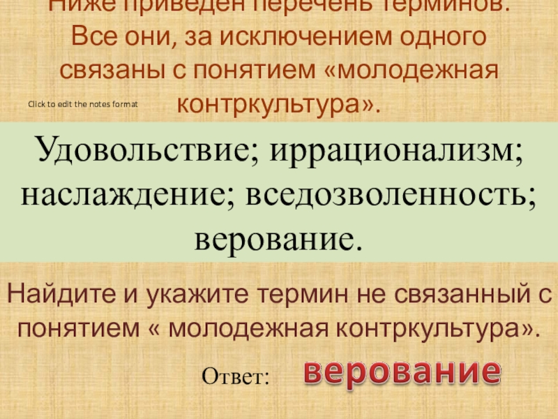 Удовольствие; иррационализм; наслаждение; вседозволенность; верование.
