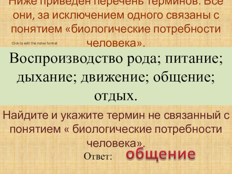 Найдите и укажите термин не связанный с понятием « биологические потребности человека».