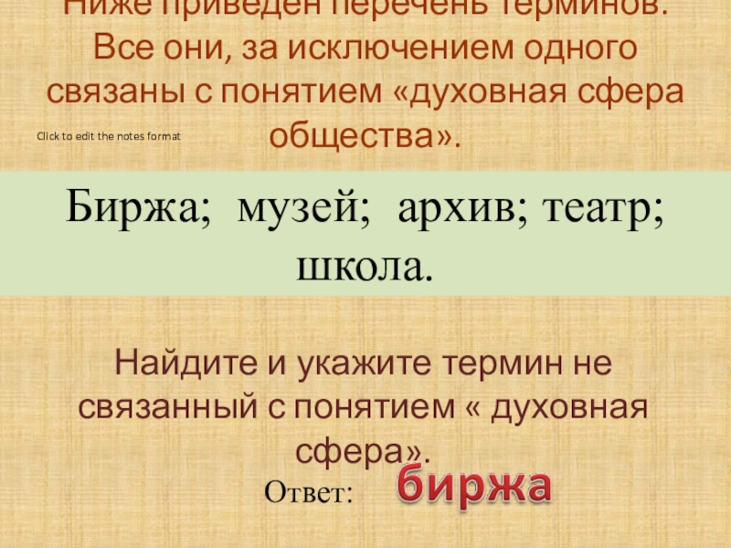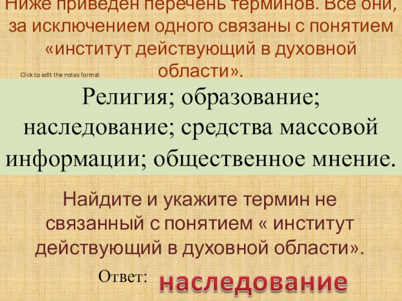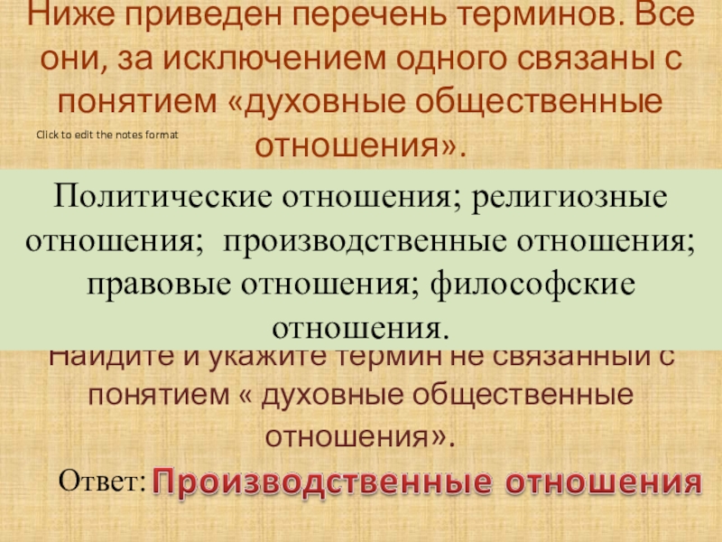Найдите и укажите термин не связанный с понятием « духовные общественные отношения».
