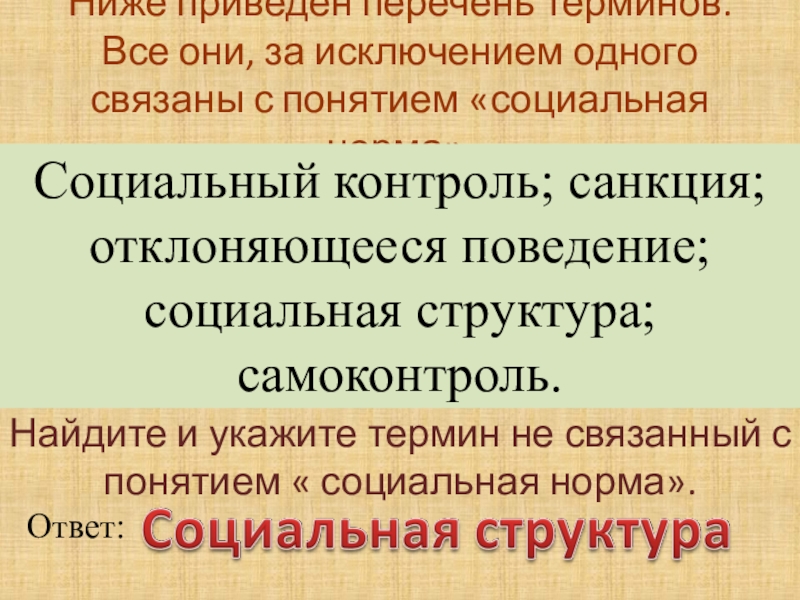 Социальный контроль; санкция; отклоняющееся поведение; социальная структура; самоконтроль.