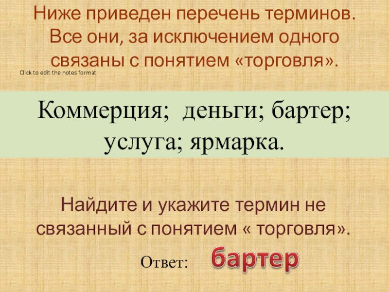 Коммерция; деньги; бартер; услуга; ярмарка.