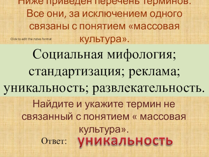 Найдите и укажите термин не связанный с понятием « массовая культура».