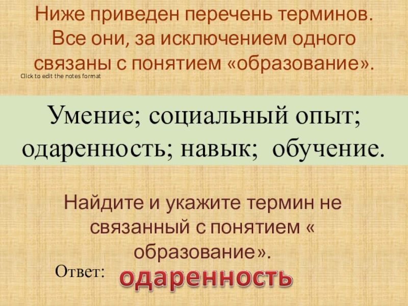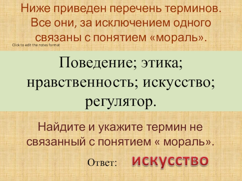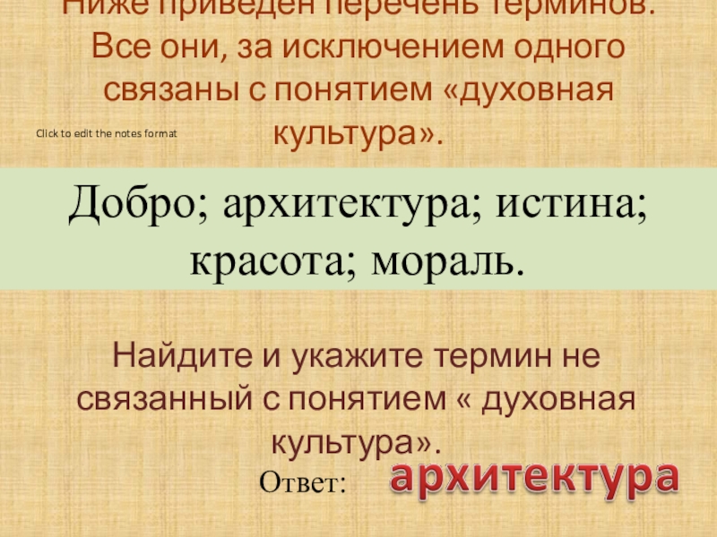 Найдите и укажите термин не связанный с понятием « духовная культура».