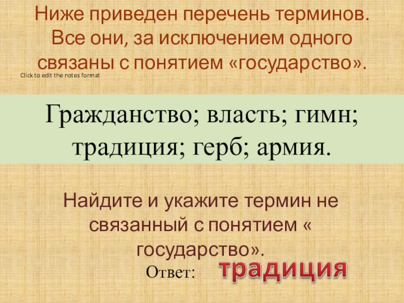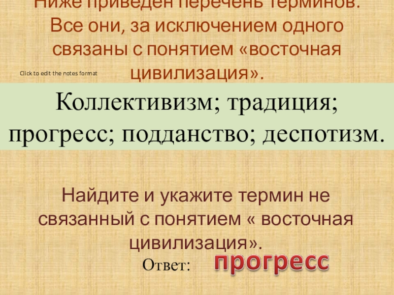 Коллективизм; традиция; прогресс; подданство; деспотизм.