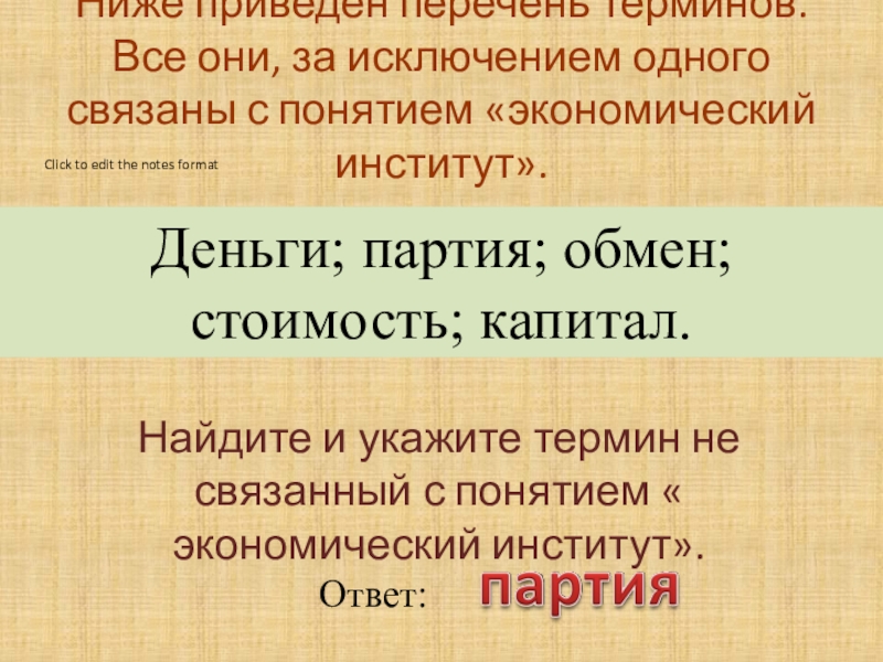 Найдите и укажите термин не связанный с понятием « экономический институт».