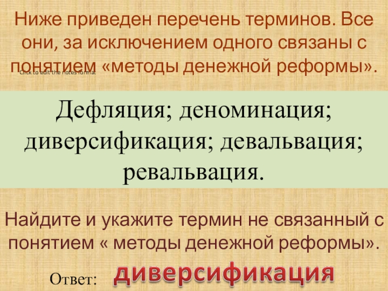 Дефляция; деноминация; диверсификация; девальвация; ревальвация.