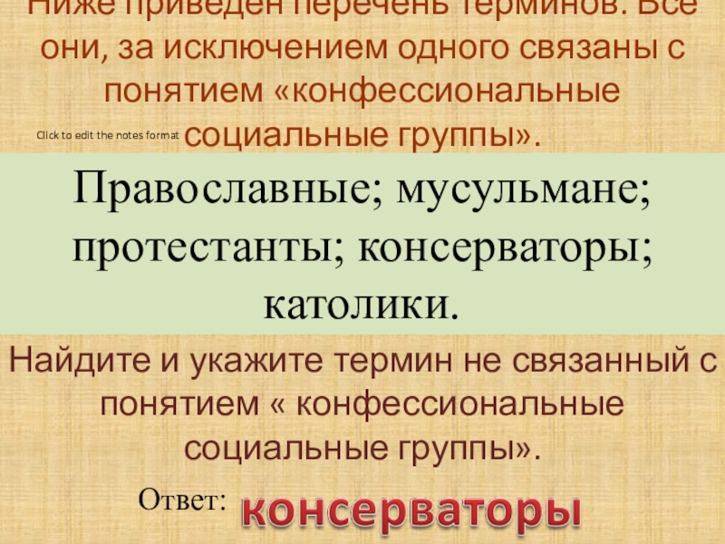 Найдите и укажите термин не связанный с понятием « конфессиональные социальные группы».